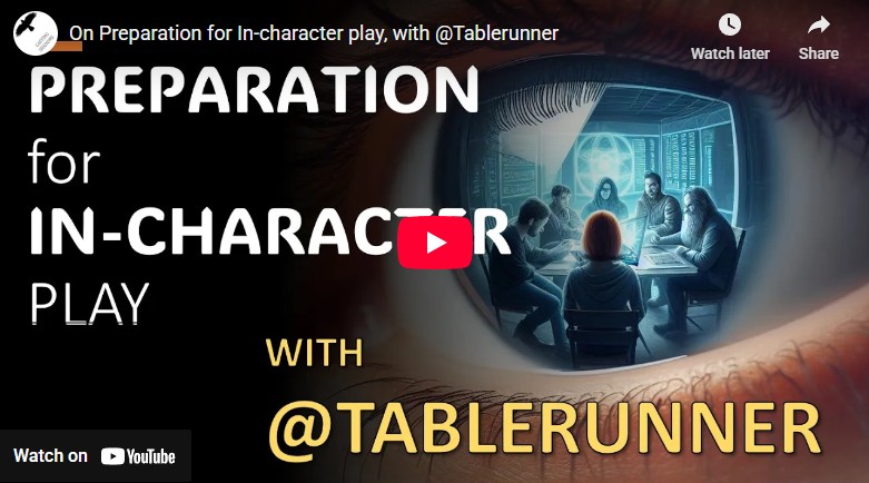 Preparation is one thing that can benefit from change if you adjust your style or intentions for play. My guest has recently discovered a desire for playing more and more in-character (moving toward in-character as-character) and leaving room for “immersion” to happen.